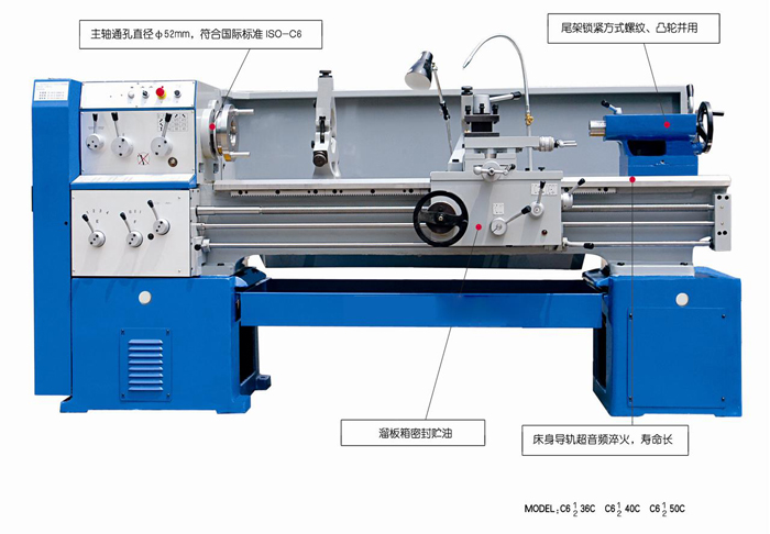 C6136普通车床床身导轨经超音频淬火和精密磨削。 主轴箱齿轮精密磨削,噪声低。 螺纹种类多。 电器安全性能好,可靠性高。 可带电磁制动,床身颜色可供多种选择。